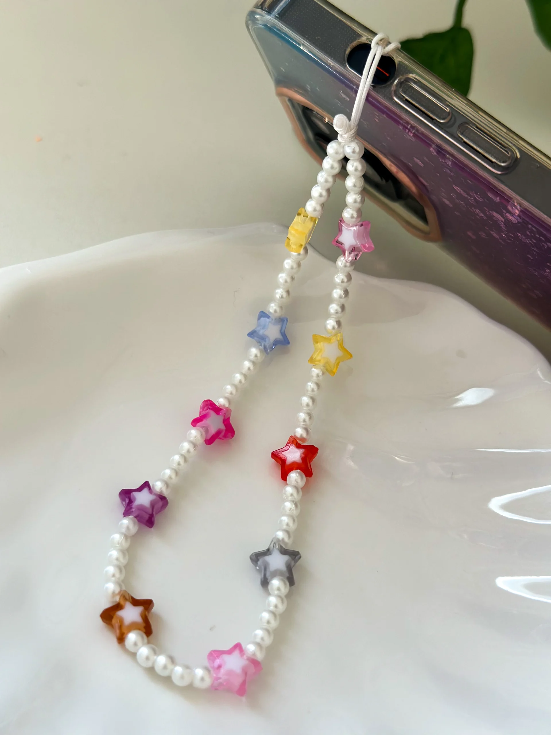 The “Stars and Pearls” phone charm showcases a stunning combination of shimmering star-shaped beads and classic pearls, creating a celestial and elegant accessory that adds a touch of whimsy to your phone.